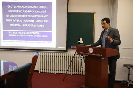 6月5日,Mostafa教授做了题为“Geotechnical Instrumentation, Monitoring, and Back Analysis of Underground Excavations and Their Interaction with Tunnel and Municipal Infrastructures”的报告。在报告中,Mostafa教授分享了他在岩土工程监测及地下开挖反分析方面的丰富经验,详细介绍了地下结构与隧道及市政基础设施相互作用的研究,重点讲解了利用先进监测技术确保地下开挖项目安全和稳定的方法。