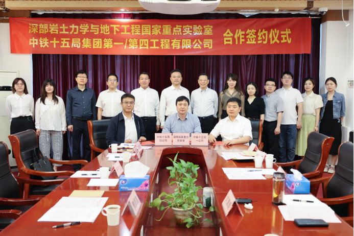 5月19日, 深部岩土力学与地下工程国家重点实验室与中铁十五局合作签约仪式在深部国重101会议室举行。中国科学院院士、深部国家重点实验室主任、中国岩石力学与工程学会党委书记、理事长何满潮,中铁十五局党委书记、董事长黄昌富,中国岩石力学与工程学会党工委书记、常务副秘书长、深部国家重点实验室教授杨军等出席签约仪式,签约仪式由中铁十五局首席科学家、副总工程师、技术中心执行主任杨宇友主持,深部国重实验室及中铁十五局有关负责同志等参加活动。
