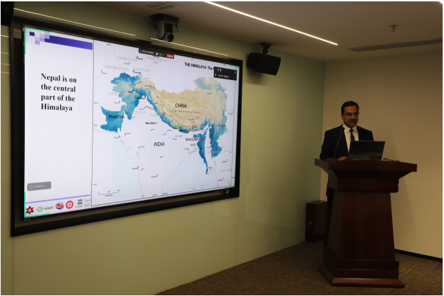 Ranjan副教授以“Preliminary Insights on the Proposed Cross-Fault Measurement Plans in the Nepal Himalaya”为题作学术报告,重点介绍了尼泊尔喜马拉雅地区的地质构造、断层分布、历史地震及滑坡灾害情况,并详细阐述了该地区跨断层测量的可行性研究方案。