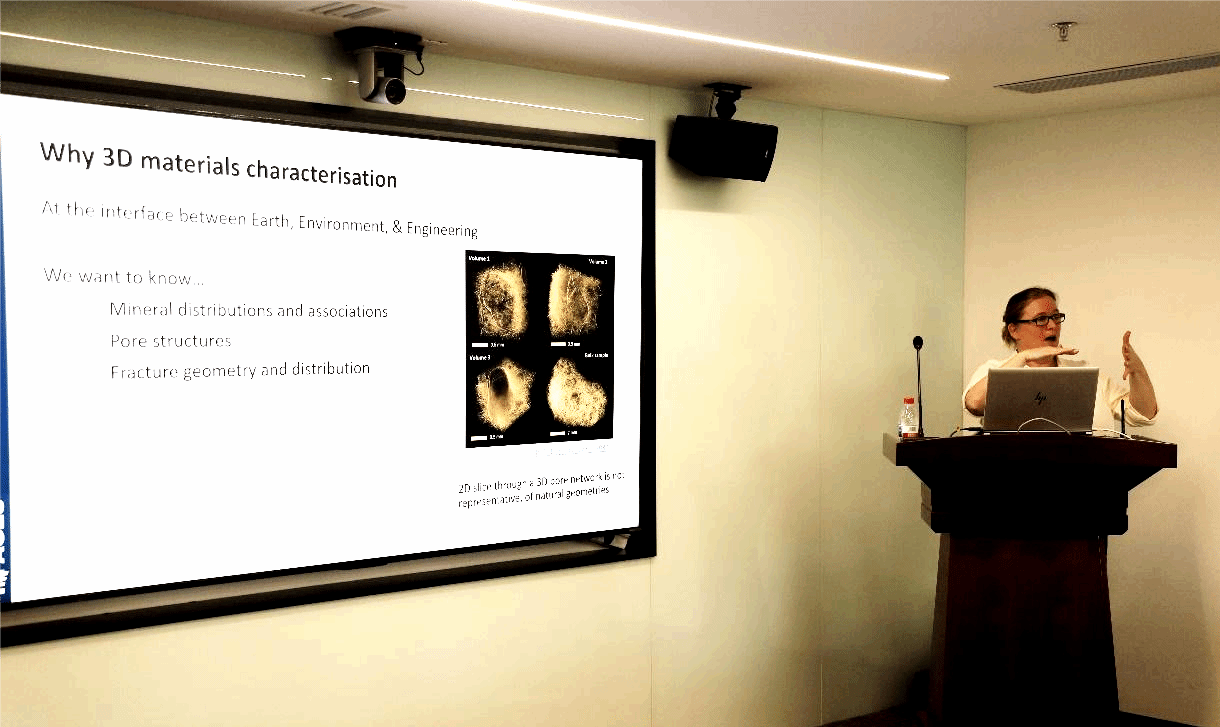 Dobson教授以“成像技术洞察关键岩土材料挑战”为题,系统展示了如何运用高速高分辨率成像技术,精准捕捉并量化材料在微米尺度下的动态行为。报告聚焦岩土材料变形与断裂、流动与反应输运、沉淀与溶解等关键科学问题,结合地球科学、材料科学及土木与环境工程等多学科实例,深入阐释了X射线断层扫描技术对材料行为认知的革新性推动作用。