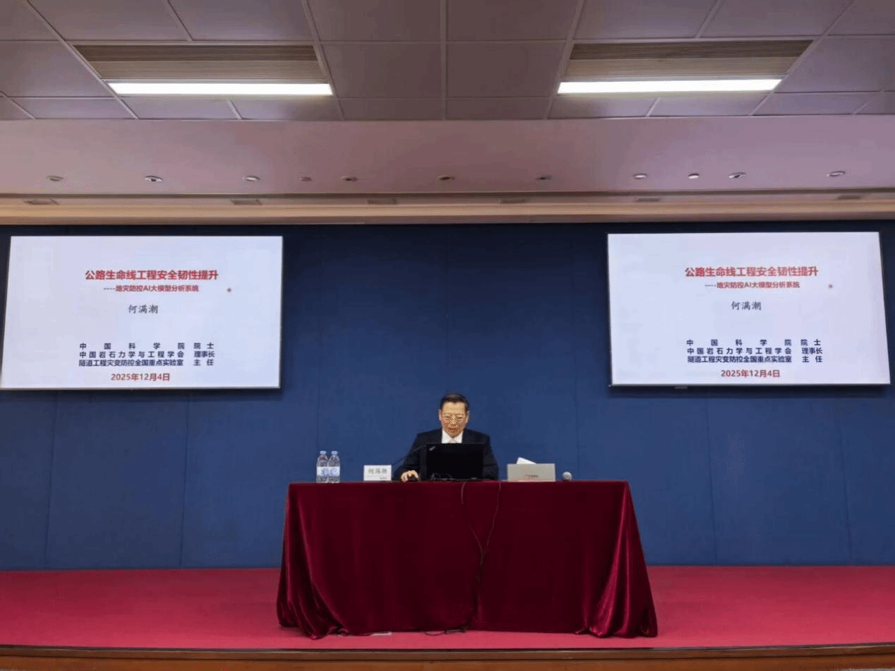 何满潮院士以“公路生命线工程安全韧性提升——地灾防控AI大模型分析系统”为题作专题报告,系统阐述了生命线工程的基本特征与安全挑战,重点介绍了灾害点智能识别方法、基于牛顿力监测的灾害预警预报技术及综合防控体系,并结合典型滑坡灾害防治案例,生动展示了相关技术的实际应用成效与价值。