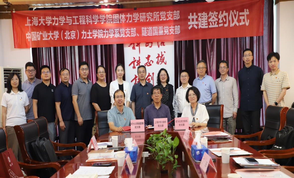 签约代表上海大学力学与工程科学学院纪委委员、固体力学研究所党支部书记郭战胜、中国矿业大学(北京)力学系党支部书记祝捷、隧道国重实验室党支部副书记刘冬桥共同表示,三方将以此次党建共建为重要契机,建立健全共建工作制度和常态化联络机制。未来将秉持“资源共享、优势互补、注重实效”的原则,在党建工作经验、信息资源、解决实际问题等方面深化合作,努力实现党支部建设与人才培养、学科发展的良性互动与共同提升,最终达到“合作共赢、赋能人才、推动学科高质量发展”的目标,促进各方全面进步、互利共赢。