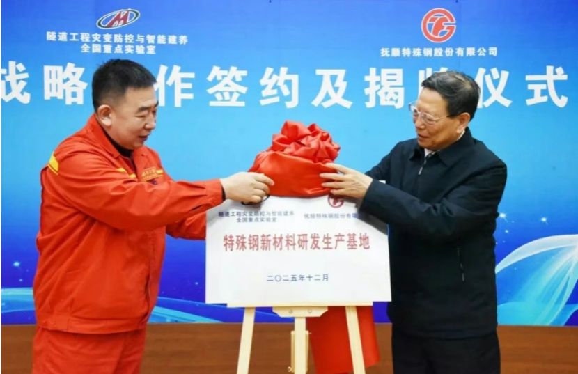 在双方代表的共同见证下,何满潮院士与孙立国董事长分别代表隧道国重实验室和抚顺特钢签署了战略合作协议,并为“特殊钢新材料研发生产基地”揭牌。